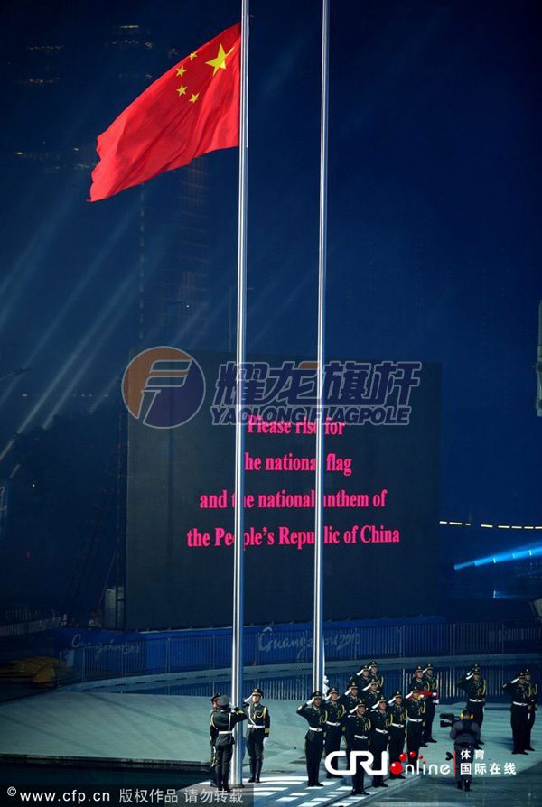 2010年11月11日晚,第十六届亚运会开幕式在广州市海心沙岛上隆重举行。随着国旗护卫队护送国旗步入会场,耀龙旗杆在国歌声中庄严的升起中华人民共和国国旗,标志着本届广州亚运会正式拉开序幕!